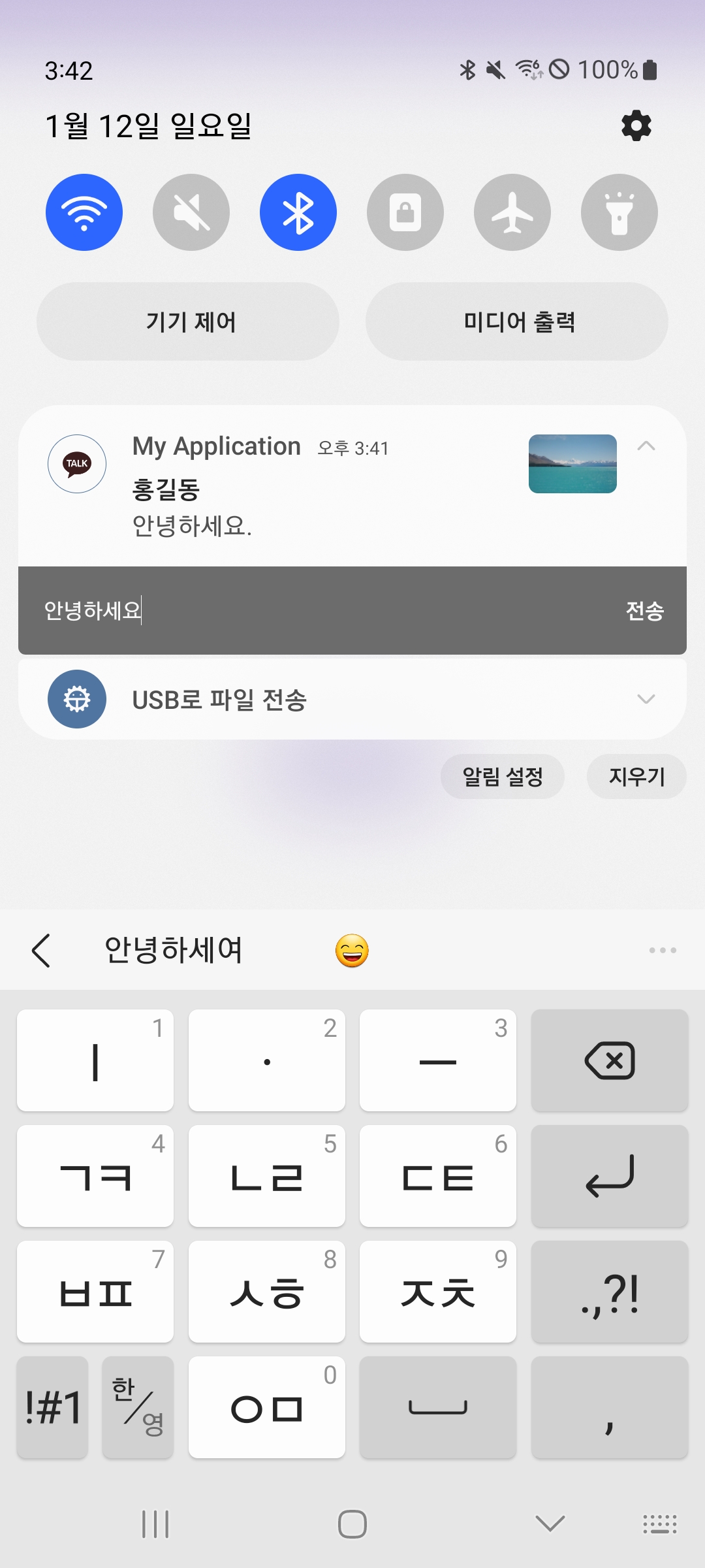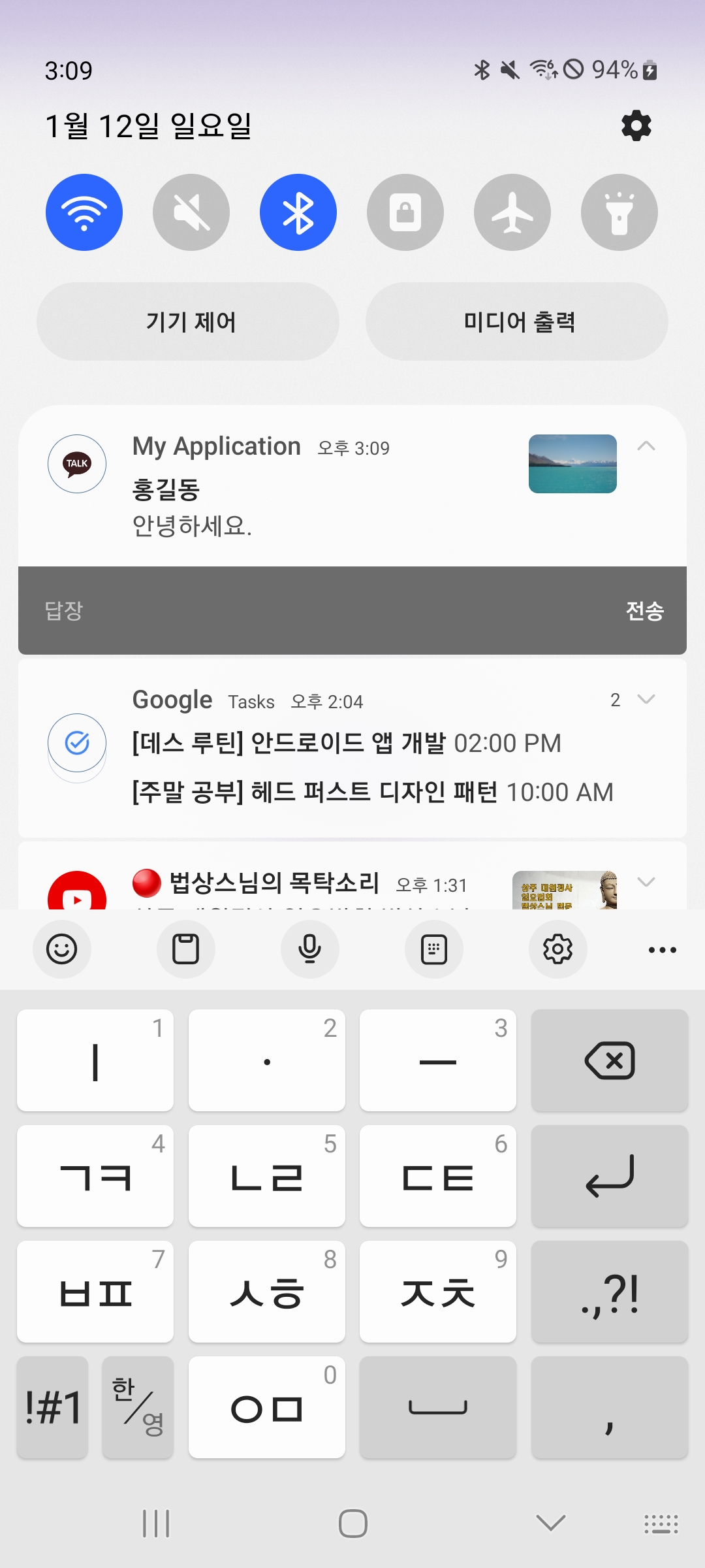 <Run> 을 클릭해 앱을 실행합니다. 앱이 실행되면 화면 가운데의 <알림 발생>을 클릭합니다. 그러면 상태 바에 스몰아이콘이 표시됩니다. 상태바를 내리면 알림을 확인할 수 있고 <답장>을 클릭하면 글을 입력할 수 있습니다.