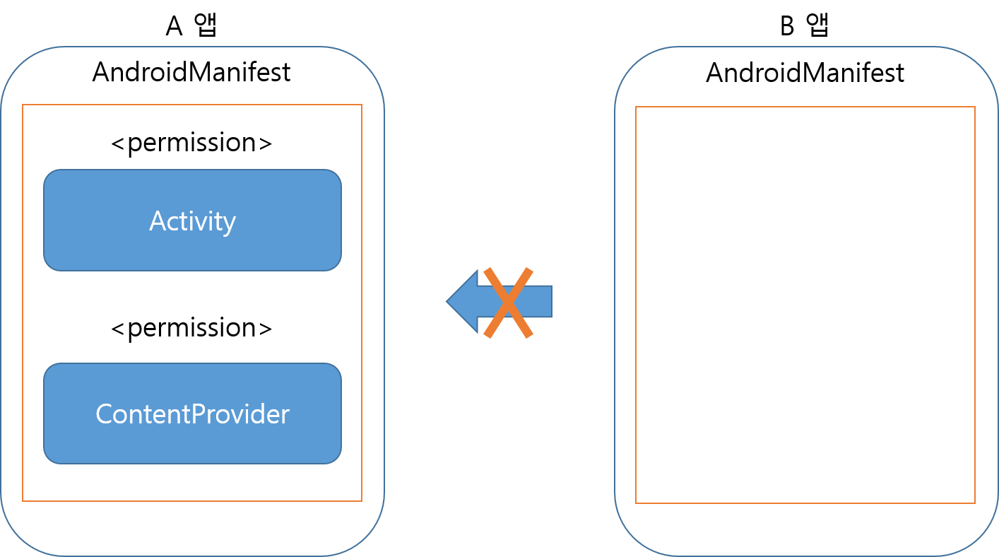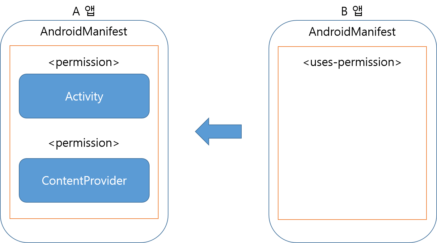 A앱의 개발자가 매니페스트 파일에 <permission> 태그로 퍼미션을 설정하면 이를 이용하는 B 앱의 코드를 아무리 잘 구현하더라도 실행되지 않습니다. 이때는 B 앱의 매니페스트 파일에 <uses-permission> 태그로 해당 퍼미션을 이용하겠다고 설정해줘야 합니다.