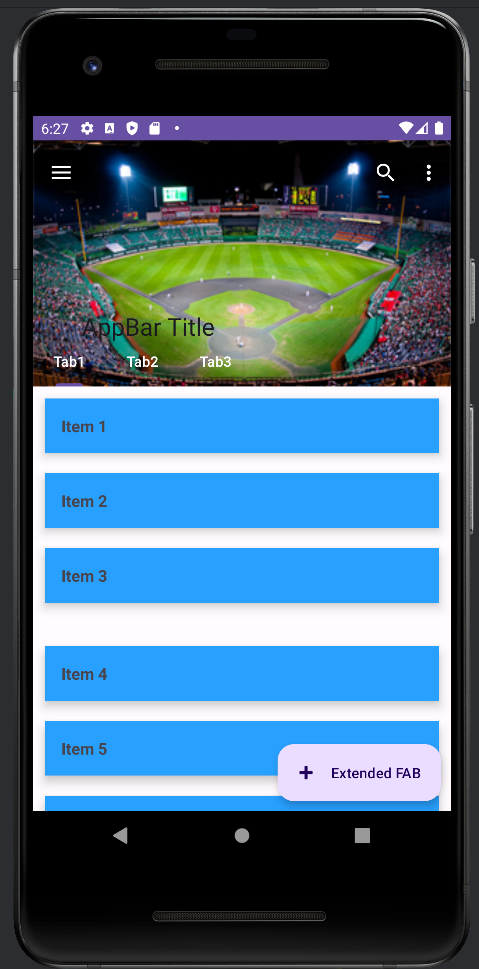 앱바 레이아웃을 사용하면 툴바뿐만 아니라 여러 가지 콘텐츠를 함께 표시할 수 있습니다. 예를 들어 다음 처럼 layout_height 속성을 이용해 위쪽 영역을 크게 만들거나 이미지를 표시할 수도 있습니다.