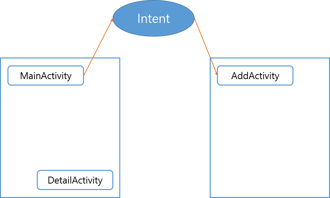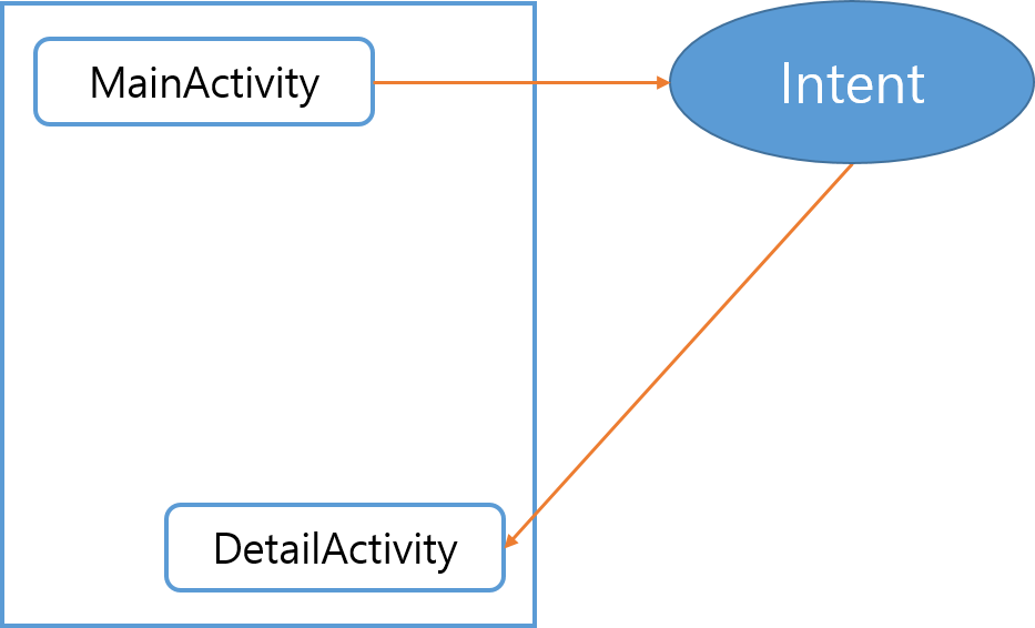 결국 MainActivity 클래스에서 DetailActivity 클래스를 실행하려면 시스템에 인텐트를 전달해줘야 합니다. 그러면 시스템에서 인텐트의 정보를 분석해서 그에 맞는 컴포넌트를 실행해 줍니다.