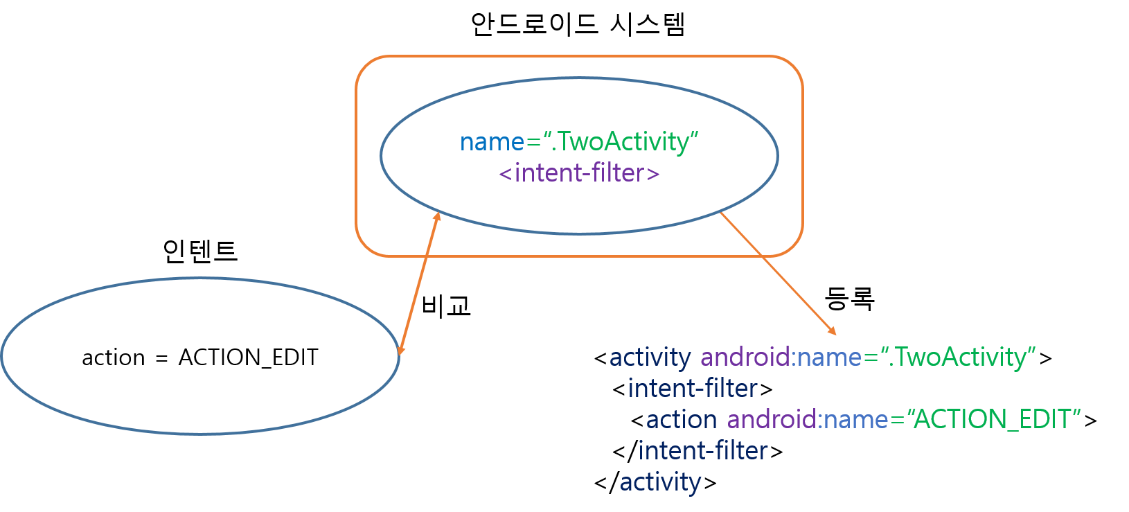 - 암시적 인텐트 : 인텐트 필터 정보를 활용한 인텐트