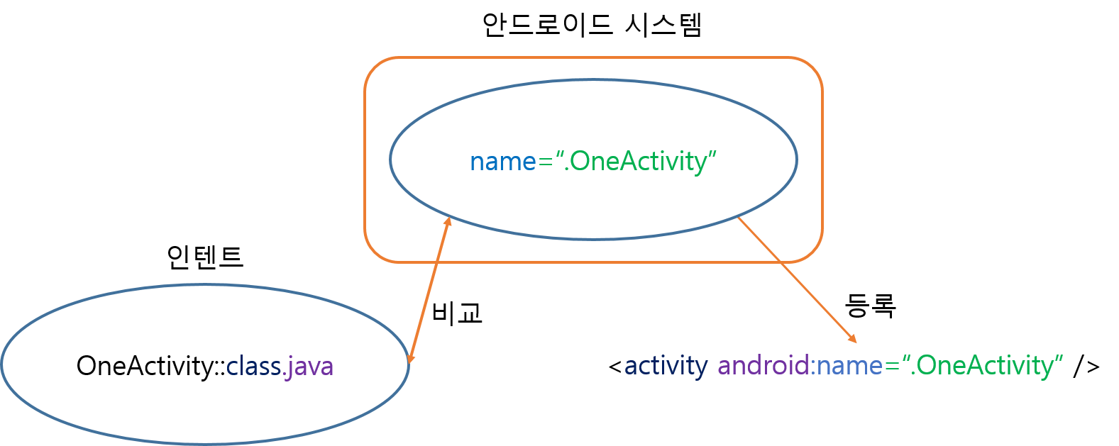 안드로이드 시스템은 매니페스트 파일의 내용을 참조하여 앱을 실행합니다. 그런데 개발자가 <activity android:name=".OneActivity" /> 처럼 액티비티의 클래스 이름만 설정하면 시스템에는 이 이름만 등록됩니다. 따라서 코드에서 인텐트에 클래스의 이름 정보(class type reference)를 지정해 줘야 등록된 정보와 일치하는지 비교해서 실행할 수 있습니다.