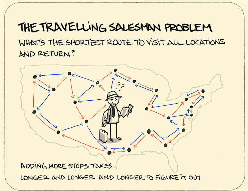 완전 탐색으로 문제를 풀기 위한 첫 번째 단계는 시간 안에 답을 구할 수 있을지 확인하는 것입니다. 우리는 시작한 도시로 돌아오는 경로를 찾기 때문에, 경로의 시작점은 신경 쓰지 않고 무조건 0번 도시에서 출발한다고 가정해도 경로의 길이는 다르지 않습니다. 그러면 남은 도시들을 어떤 순서로 방문할지를 정하기만 하면 되지요. n-1 개의 도시를 나열하는 방법은 모두 (n-1)! 가지가 있습니다. 도시가 열 개라면 경로의 수는 9! = 362,880 개가 됩니다. 물론 사람이 찾아보기에는 너무 큰 수입니다. 여전히 컴퓨터는 1초 안에 가볍게 처리할 수 있는 숫자입니다. 따라서 안전하게 완전 탐색을 사용해 문제를 해결할 수 있음을 알 수 있습니다.