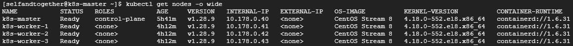 워커노드에 배포된 파드들 모두 Running 상태로 정상 배포된 것을 확인할 수 있습니다. 서비스 테스트를 하기 위한 파드 준비는 완료되었습니다.