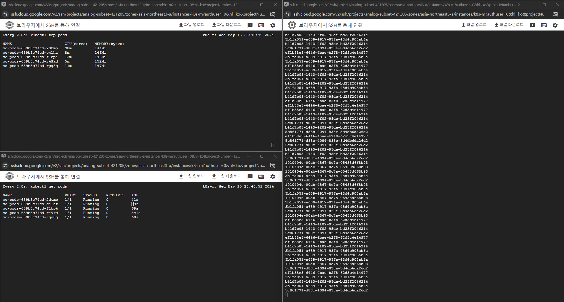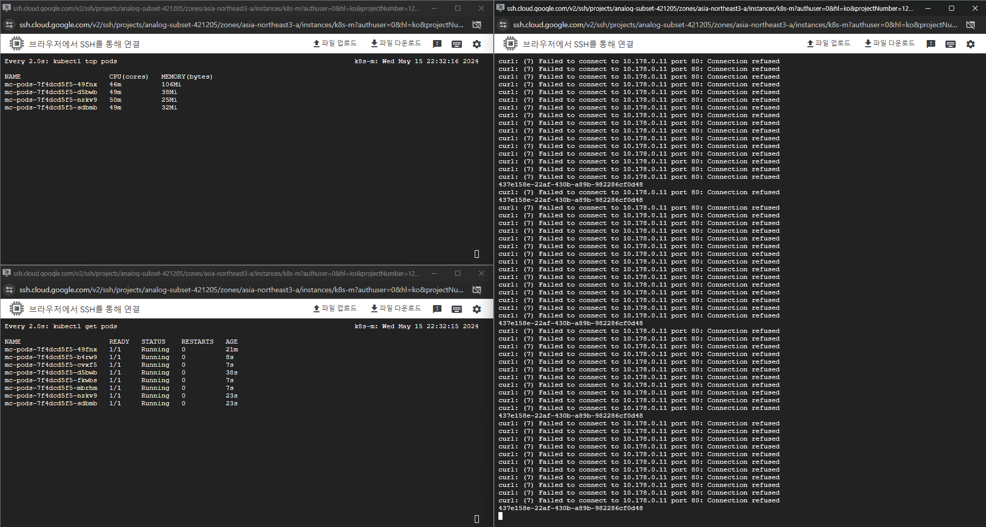 n1-standard-4 로 서버 사양을 업그레이드하고 오토스케일링 테스트 준비를 마쳤습니다. 이번에는 kubectl edit deployment mc-pods 에서 requests.cpu 는 200m(0.2 CPU)로 limits.cpu 를 1000m(1 CPU) 으로 늘렸습니다.