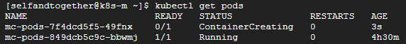 resources의 수정을 마친후에 vi에서 편집한 것 처럼 :wq 를 누르면 수정한 내용이 반영됩니다. 파드 현황을 보면 스펙이 변경되어 새로운 파드가 생성되는 것을 확인할 수 있습니다.