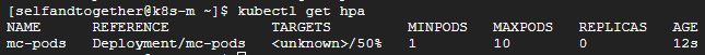 kubectl autoscale deployment mc-pods --min=1 --max=10 --cpu-percent=50