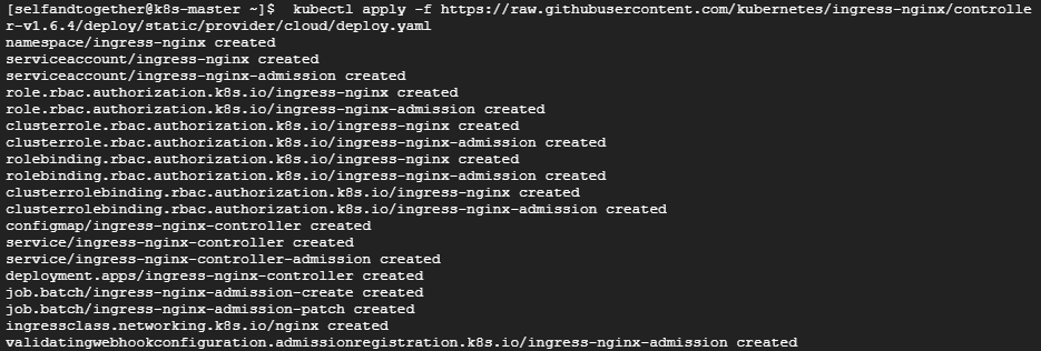 기존 파드에 더하여 새로운 파드가 더해져 총 6개의 파드를 확인할 수 있습니다. 그러면 이제 인그레스 서비스를 설치해보도록 하겠습니다. 인그레스를 사용하려면 인그레스 컨트롤러가 필요한데 이 글에서는 Nginx 인그레스 컨트롤러를 사용하겠습니다. 아래 명령문을 실행하여 인그레스 컨트롤러를 설치해줍니다.