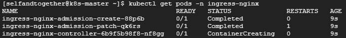 Nginx 인그레스 컨트롤러를 설치하면 기본적으로 ingress-nginx 네임스페이스를 생성하고 사용합니다. 그래서 아래와 같이 명령문을 실행하여 인그레스 컨트롤러가 정상적으로 설치되었는지 확인합니다.