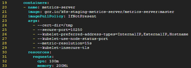 metrics-server 에 인증 정보 구성이 안되어 있기 때문에 deployment.yaml 파일에서 인증 기능 비활성 옵션을 추가해줍니다.