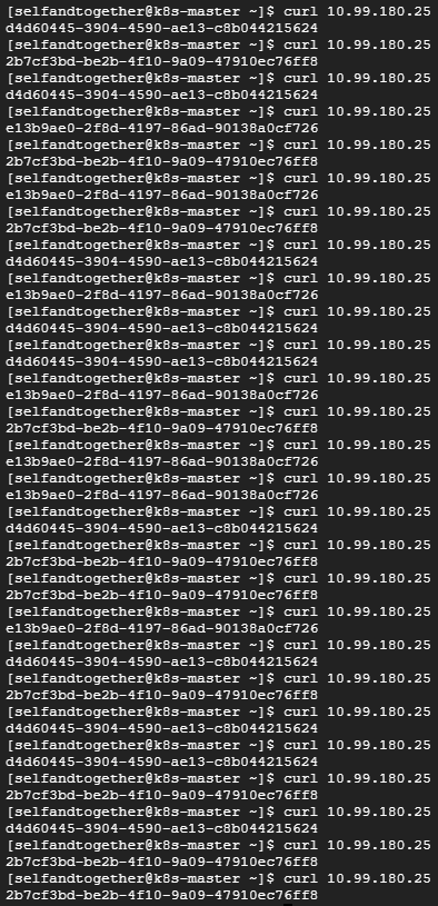 생성된 클러스터 IP 로 curl 테스트를 해본 결과 요청에 대한 부하 분산이 잘 이루어지 것을 확인할 수 있습니다.