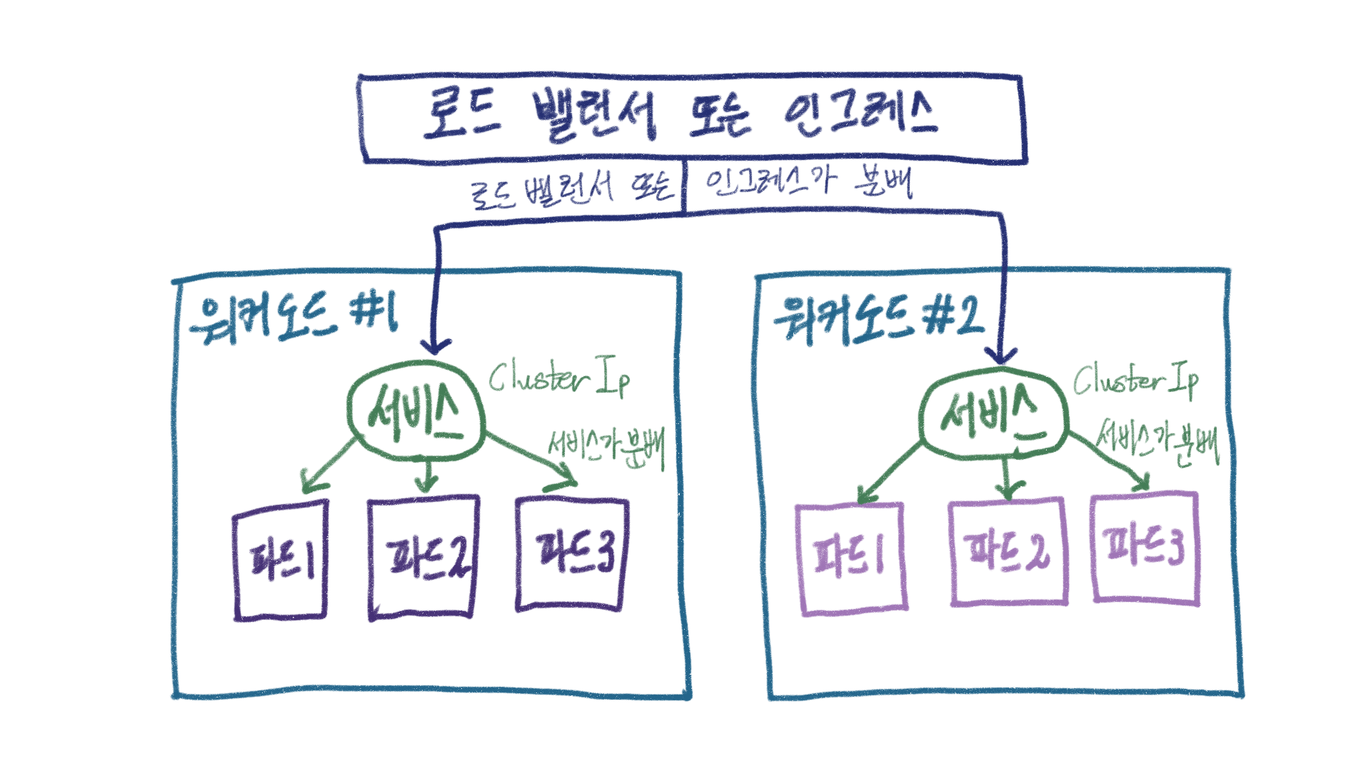 쿠버네티스에서 서비스의 역할은 쉽게 말해 로드 밸런서입니다. 서비스는 여러 파드를 담당하는 반장역할을 하며 고정된 IP(Cluster IP) 를 갖습니다. 이 주소로 들어오는 통신을 처리합니다. 내부적으로 여러 파드가 있어도 밖에서는 Cluster IP 만 볼 수 있으며 이 주소로 접근하면 서비스가 통신을 적절히 분배해줍니다. 하지만 Cluster IP 로 서비스가 분배하는 통신은 한 워커 노드 안으로 국한됩니다. 여러 워커 노드 간의 분배는 실제 로드 밸러서(Load Balancer) 또는 인그레스(Ingress)가 담당합니다.