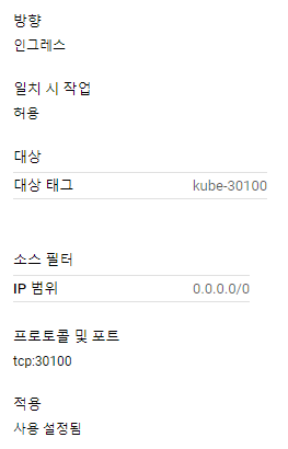 인그레스 브라우저 테스트를 위해서 인그레스 컨트롤러 노드포트의 사용포트를 방화벽에서 오픈해주도록 하겠습니다. 아래와 같이 30100, 30101 포트를 허용하는 방화벽 규칙을 생성해줍니다.