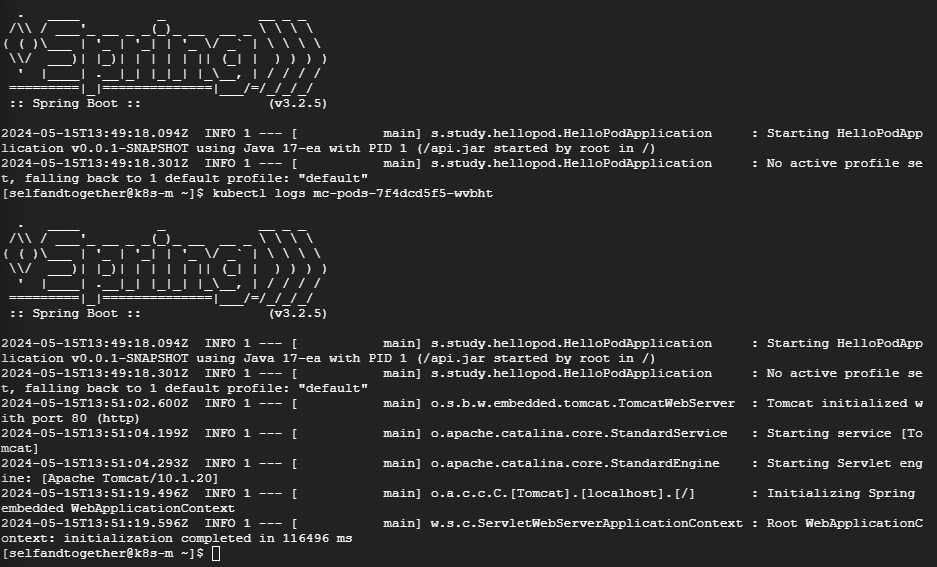 새로 추가된 파드가 초기에 에러로 응답하는 부분과 관련해서 확인해보던중 파드의 로그를 보니 스프링부트 애플리케이션의 Tomcat 구성단계에서 시간이 오래걸리는 것을 확인하였습니다.